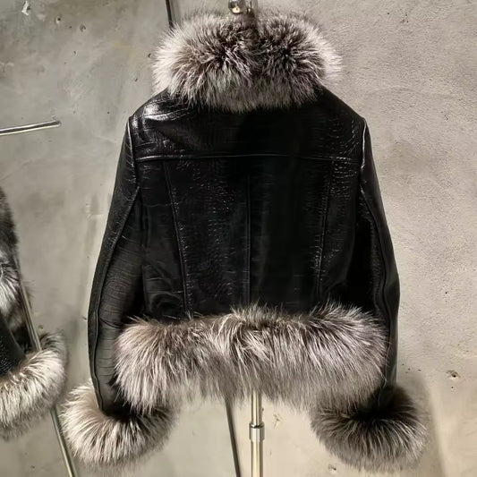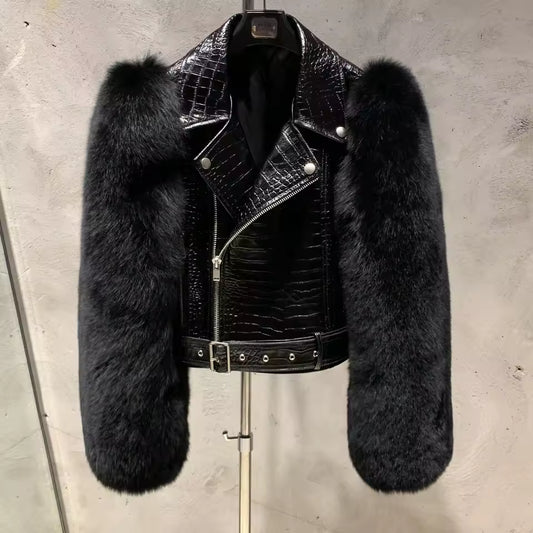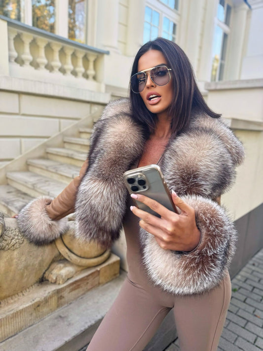 Cropped Shearling Leather Coat with Natural Fur Sleeves