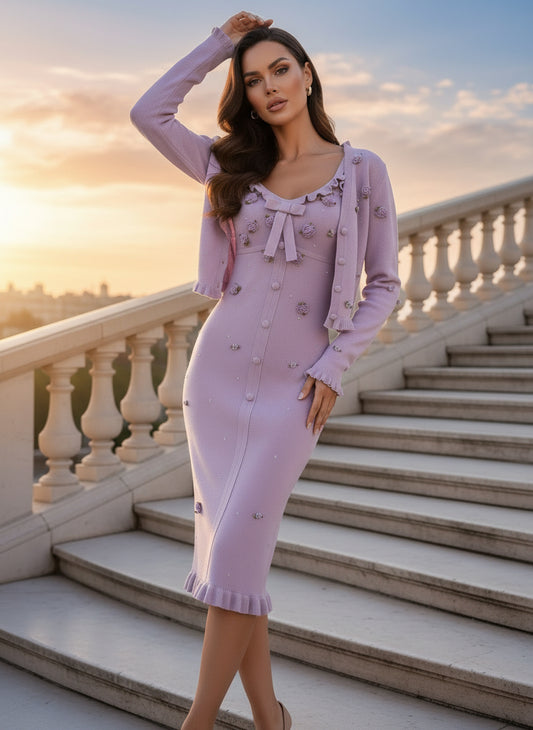 Pearl Edge Knitted Long Sleeve Top & Slim Fit Sleeveless Dress Set