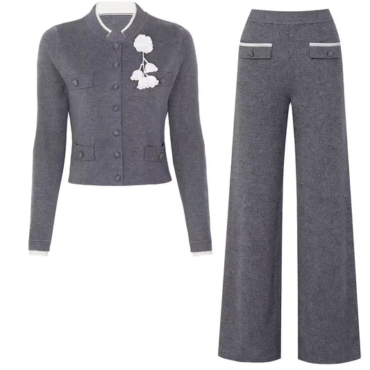 Flower Accent Knit Vest & Solid Pants Two-Piece Set