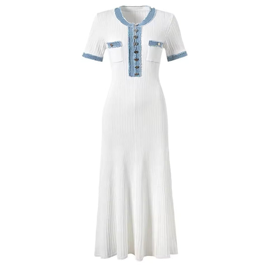 Pinned Denim Short Sleeve Knit Maxi Dress – Slim Fit Casual Chic