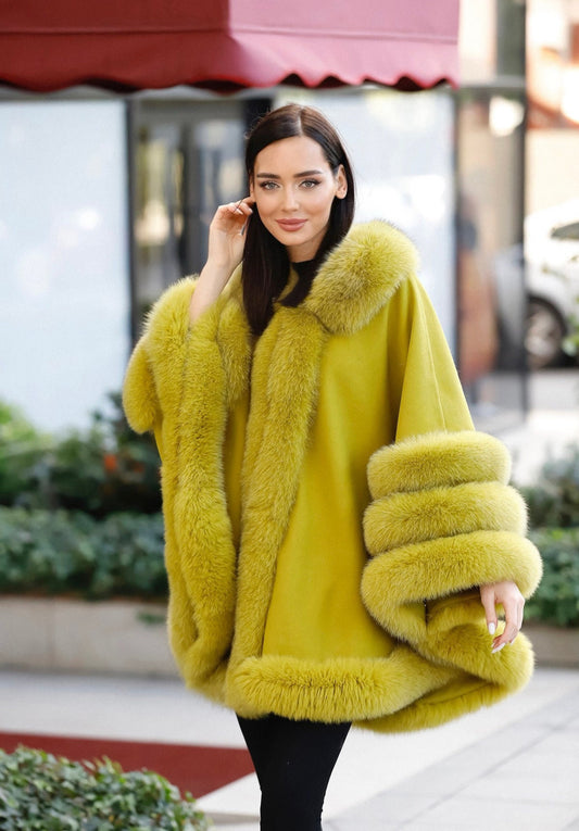 PONCHO DE CASHMERE DE PIEL DE ZORRO MOSTAZA