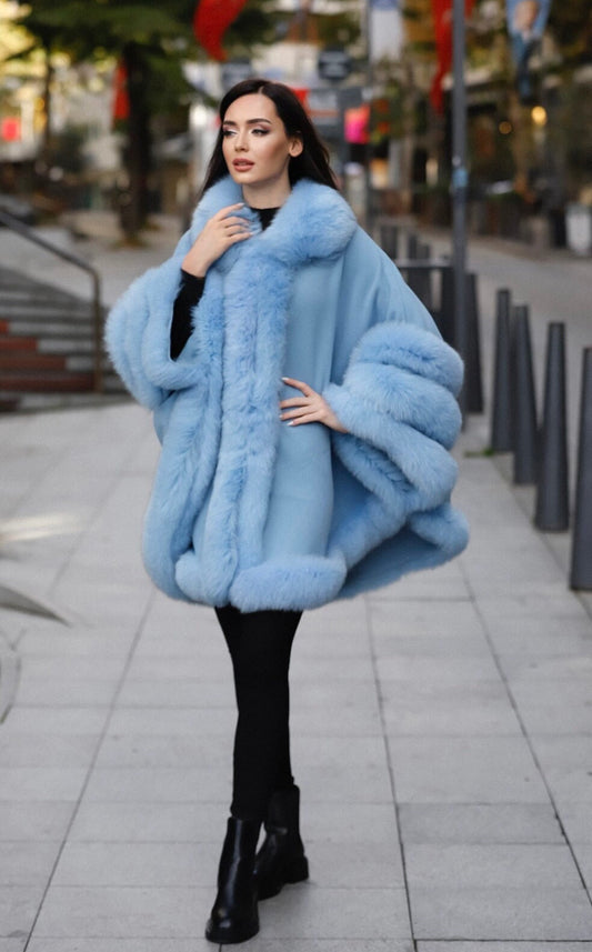 PONCHO DE CASHMERE DE PELO DE ZORRO EN AZUL CIELO