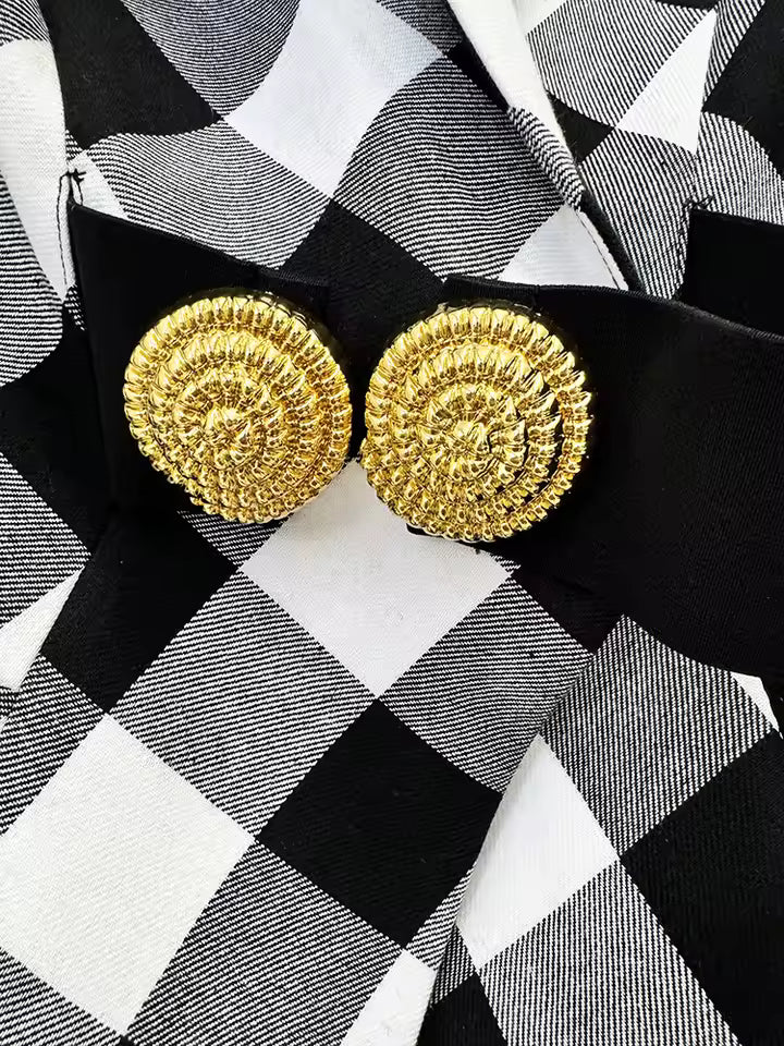 Refine your wardrobe with the Black and White Checked Slim Blazer with Metal Buckle. This high-fashion piece combines classic patterns with modern detailing to create a striking, versatile look.