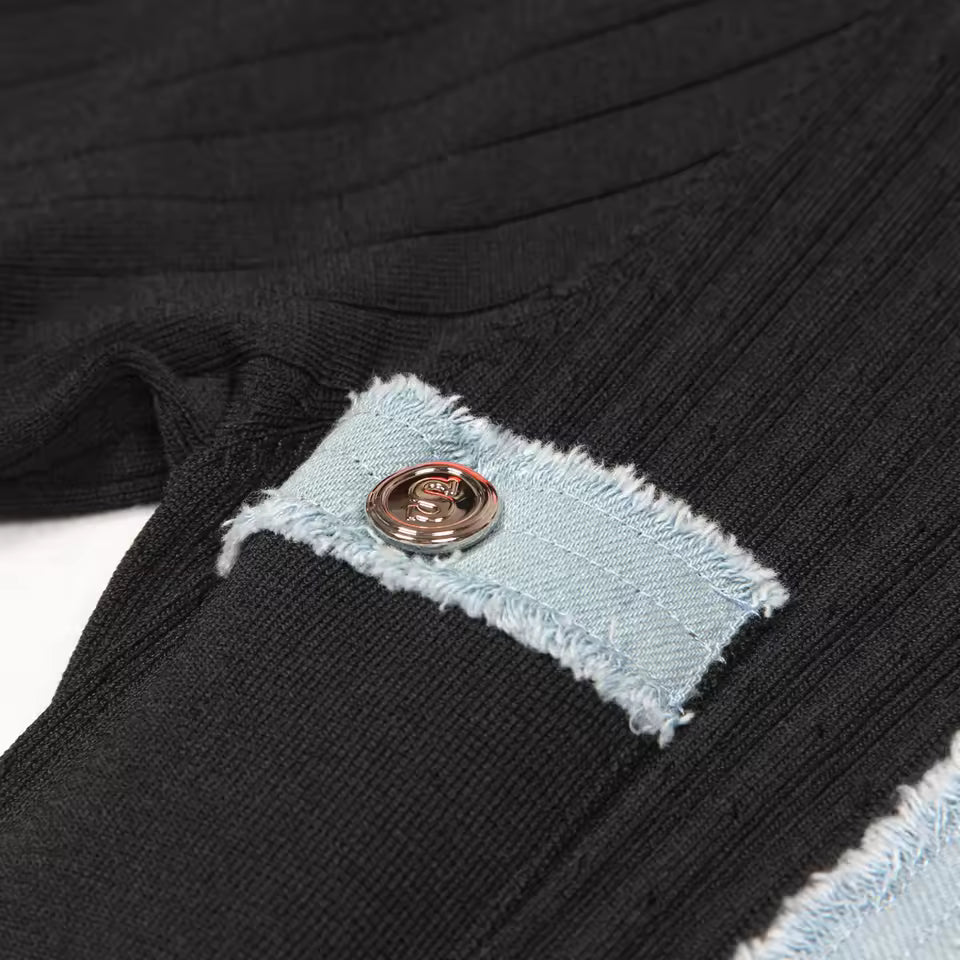 Add effortless style to your wardrobe with this pinned denim short sleeve knit maxi dress. Crafted with a soft yet resilient knit, this slim fit dress flatters your natural shape while ensuring all-day comfort. The subtle denim-inspired accents and decorative pin detail bring a touch of modern edge to a classic silhouette. Perfect for casual outings, brunch dates, or a relaxed office look.