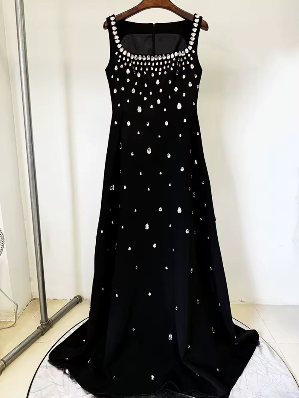 Turn heads in this black long evening dress, shimmering with delicate crystal drops. A timeless piece that speaks elegance, confidence, and pure glamour.