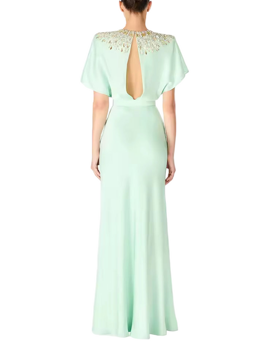 Backless Shiny Satin Diamond Beaded Maxi Dress