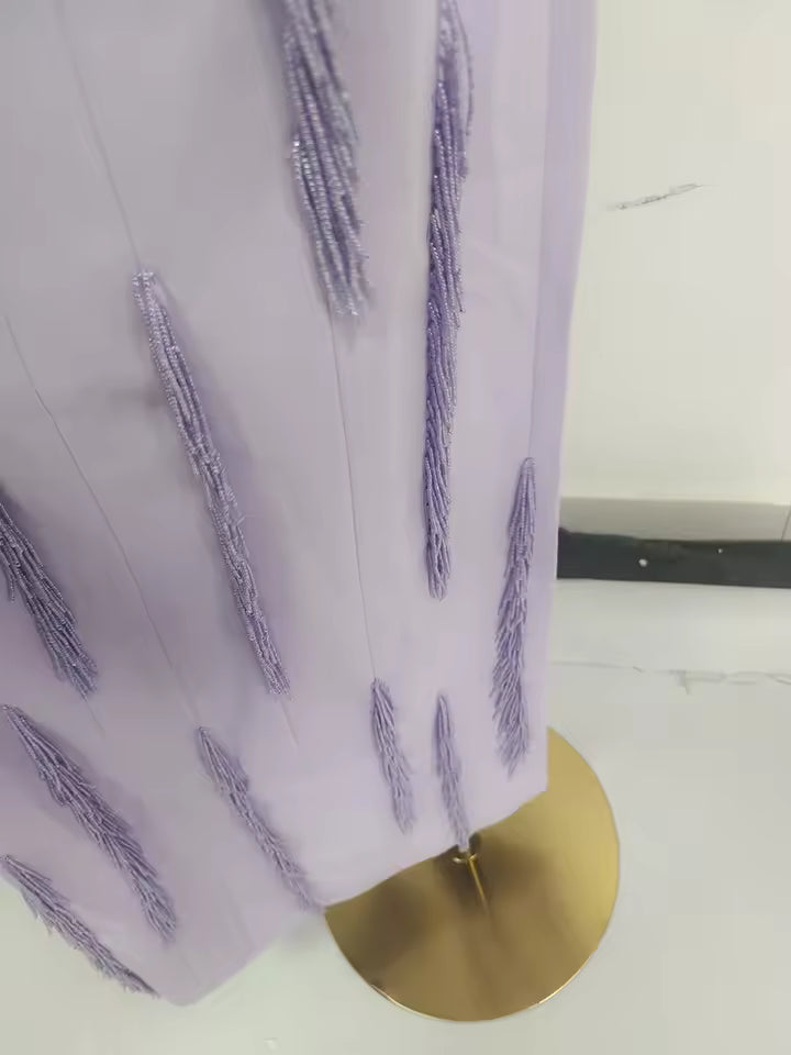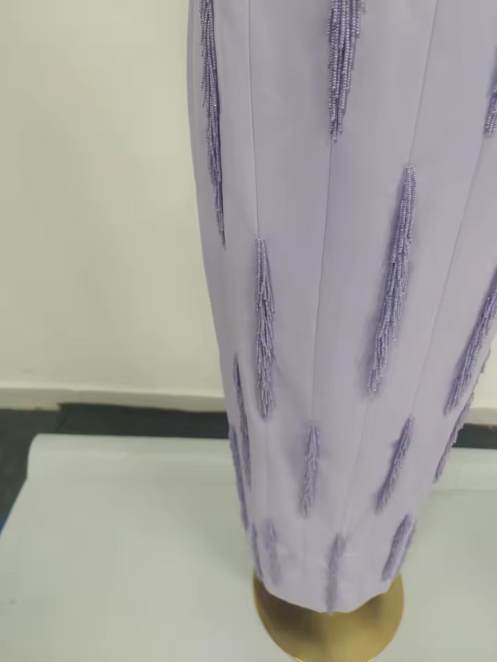 Make a stunning entrance in this Purple Strapless Beaded Split Maxi Dress, designed to combine elegance and allure. The flattering strapless cut highlights the shoulders, while intricate beading and a sleek side split create a graceful yet bold look.