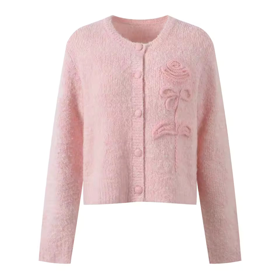 Wrap yourself in effortless style with this beautifully crafted solid knit cardigan featuring a subtle rose accent design. Its classic O-neck and single-breasted closure create a polished look that’s perfect for work, casual outings, or layering on cooler days.