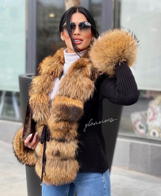 CARDIGAN CORTO IN CASHMERE/MAGLIA DI PELLICCIA DI RACON IN NERO