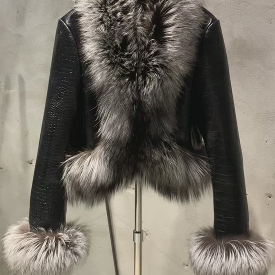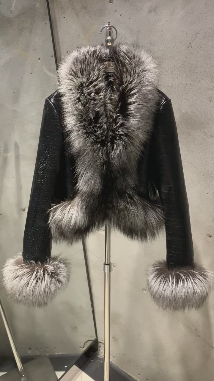 Cropped Shearling Leather Coat with Natural Fur Sleeves