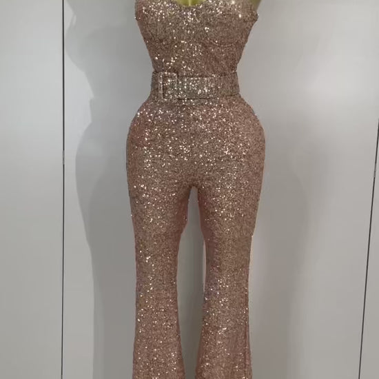 Command attention with this Shiny Sequin Halter Backless Bodycon Jumpsuit, designed for those who love bold, head-turning style. Its sleek cut and shimmering finish make it ideal for upscale parties and special occasions.