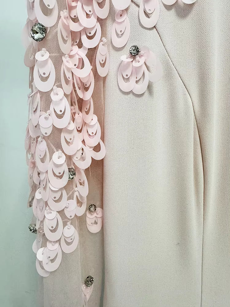 Bring red-carpet glamour to any event with the Split Mesh Diamond Beaded Long Sleeve Maxi Dress. This striking gown combines couture-level beading with an elegant floor-length silhouette for a stunning, memorable look.