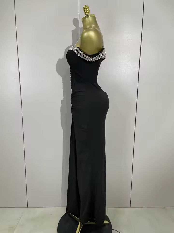 Crystal Embellished Off-Shoulder Maxi Dress – Black