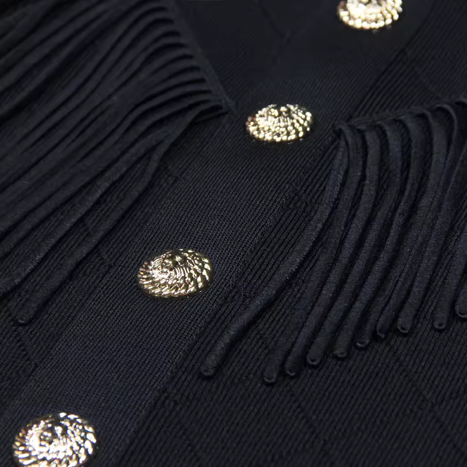 Elevate your wardrobe with this versatile tassel-accented knitted dress—a timeless design that combines elegance and comfort for any occasion.