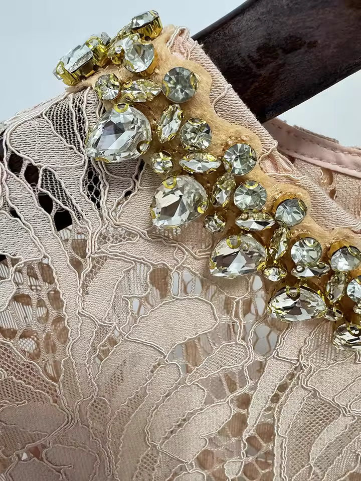 Bring timeless elegance to your wardrobe with this exquisite rhinestone lace midi dress. Crafted with fine lace and delicate rhinestone accents, it offers a refined look that transitions effortlessly from office events to evening occasions. The three-quarter sleeves and classic O-neckline provide sophisticated coverage, while the tailored fit highlights natural curves for a graceful silhouette.