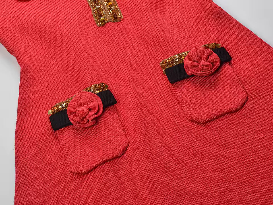 Rose Accent Knitted Mini Dress – V-Neck Long Sleeve