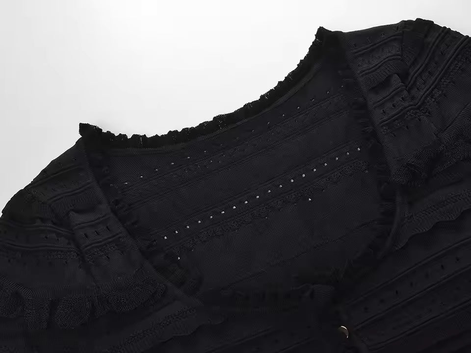 - Square Neck Cardigan – Features delicate ruffle detailing for a feminine touch.
