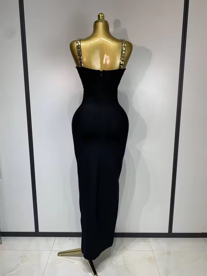 A striking bandage midi dress designed to sculpt the silhouette. Featuring gold stud embellishments on the bodice with a split-style bust detail that creates a bold, cutout effect, finished with a sleek fitted skirt and side slit for added allure.