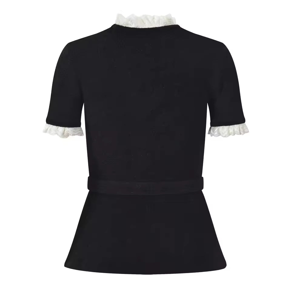 Vintage French Lace Patchwork O-Neck Short Sleeve Knit Cardigan with Belt