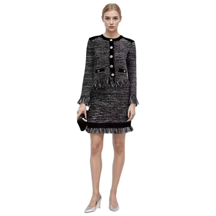 Add a touch of classic charm to your wardrobe with this vintage-inspired two-piece knit set featuring a tassel-trimmed vest and a sleek sleeveless mini dress. Designed with a refined O-neck and single-breasted closure, it delivers effortless elegance for both casual and dressy occasions.